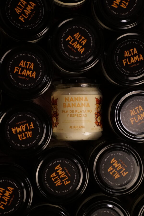 Esta vela no huele al plátano fresco, sino al bizcocho caliente recién salido del horno: húmedo, especiado y con un toque frutal que se funde entre la canela, la nuez moscada y la vainilla.